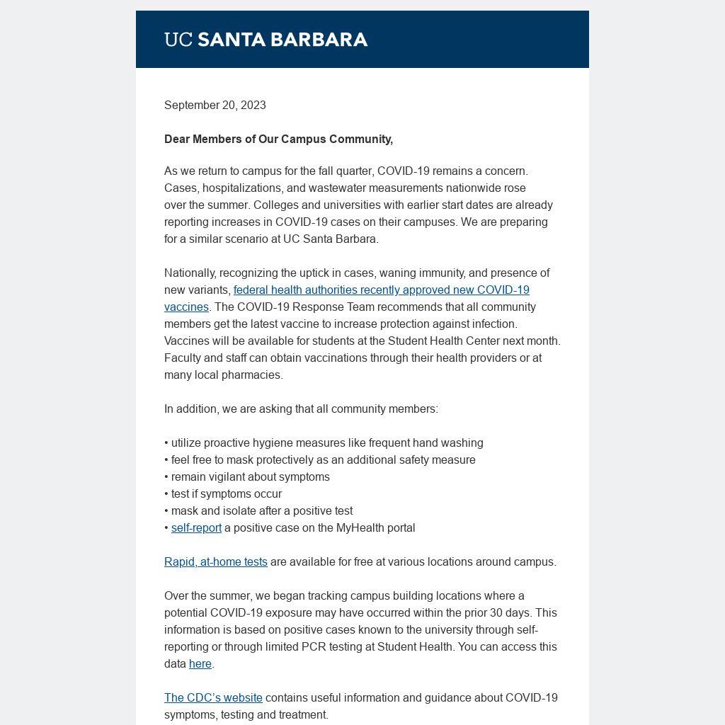 As we return to campus for the fall quarter, COVID-19 remains a concern. Cases, hospitalizations, and wastewater measurements nationwide rose over the summer. Colleges and universities with earlier start dates are already reporting increases in COVID-19 cases on their campuses. We are preparing for a similar scenario at UC Santa Barbara.