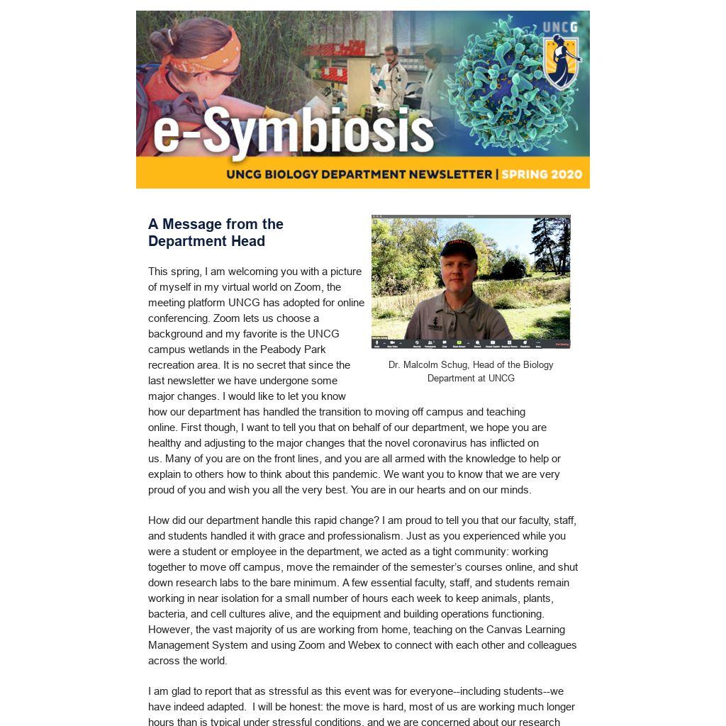 This spring, I am welcoming you with a picture of myself in my virtual world on Zoom, the meeting platform UNCG has adopted for online conferencing. Zoom lets us choose a background and my favorite is the UNCG campus wetlands in the Peabody Park recreation area. It is no secret that since the last newsletter we have undergone some major changes. I would like to let you know how our department has handled the transition to moving off campus and teaching online. First though, I want to tell you that on behalf of our department, we hope you are healthy and adjusting to the major changes that the novel coronavirus has inflicted on us. Many of you are on the front lines, and you are all armed with the knowledge to help or explain to others how to think about this pandemic. We want you to know that we are very proud of you and wish you all the very best. You are in our hearts and on our minds.