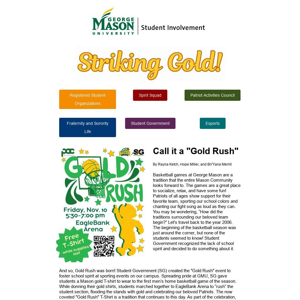 Today, the tradition continues as SG and PAC collaborate to create an evening of Mason Pride with Gold Rush! Now in its seventeenth consecutive year, Student Government and PAC bring you this year’s Gold Rush on Friday, November 10, 2023 at EagleBank arena before the game begins! Join us from 5:30-7:00pm to grab your free T-shirt and join in on the fun! Supplies are limited, so get there early. When doors open for the big game, we will all rush the stands together and the basketball season will begin! Come show your school spirit and get ready for GOLD RUSH!