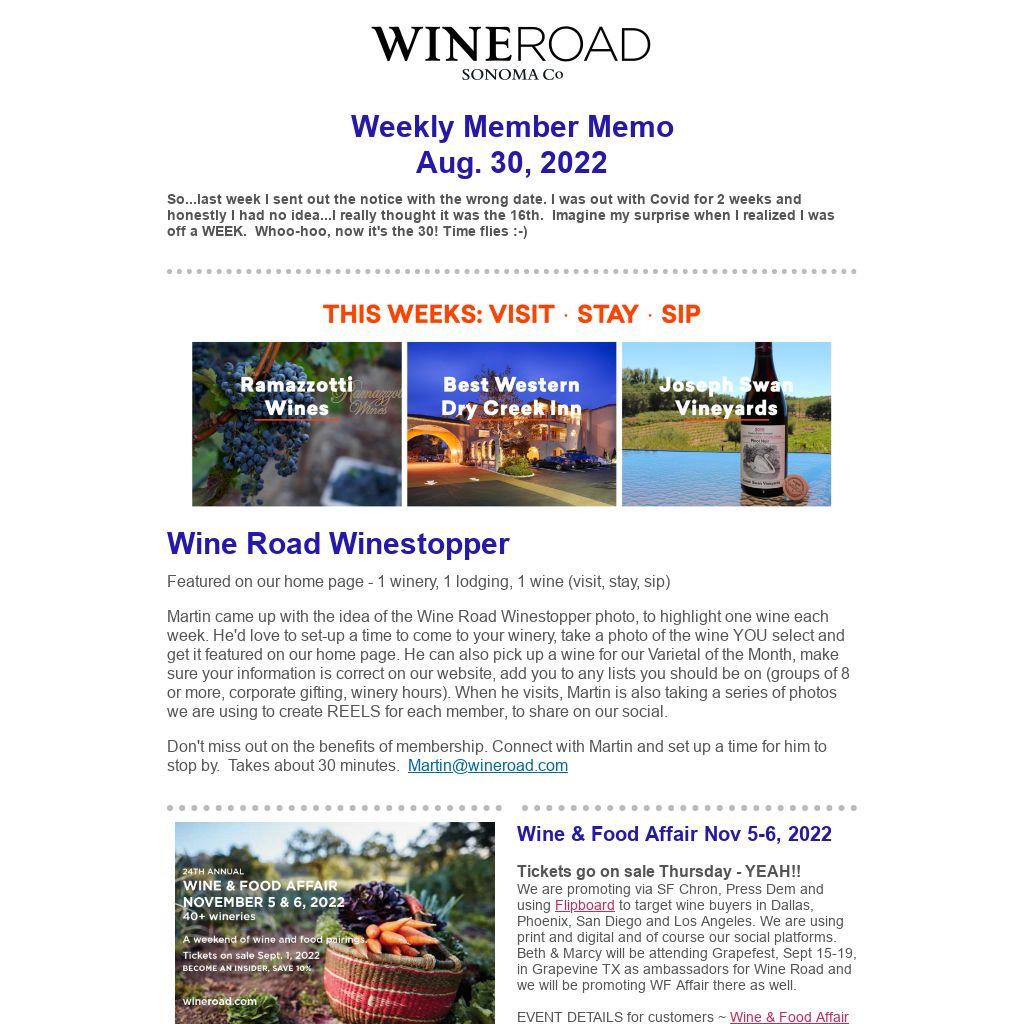 Don't miss out on the benefits of membership. Connect with Martin and set up a time for him to stop by. Takes about 30 minutes. Martin@wineroad.com