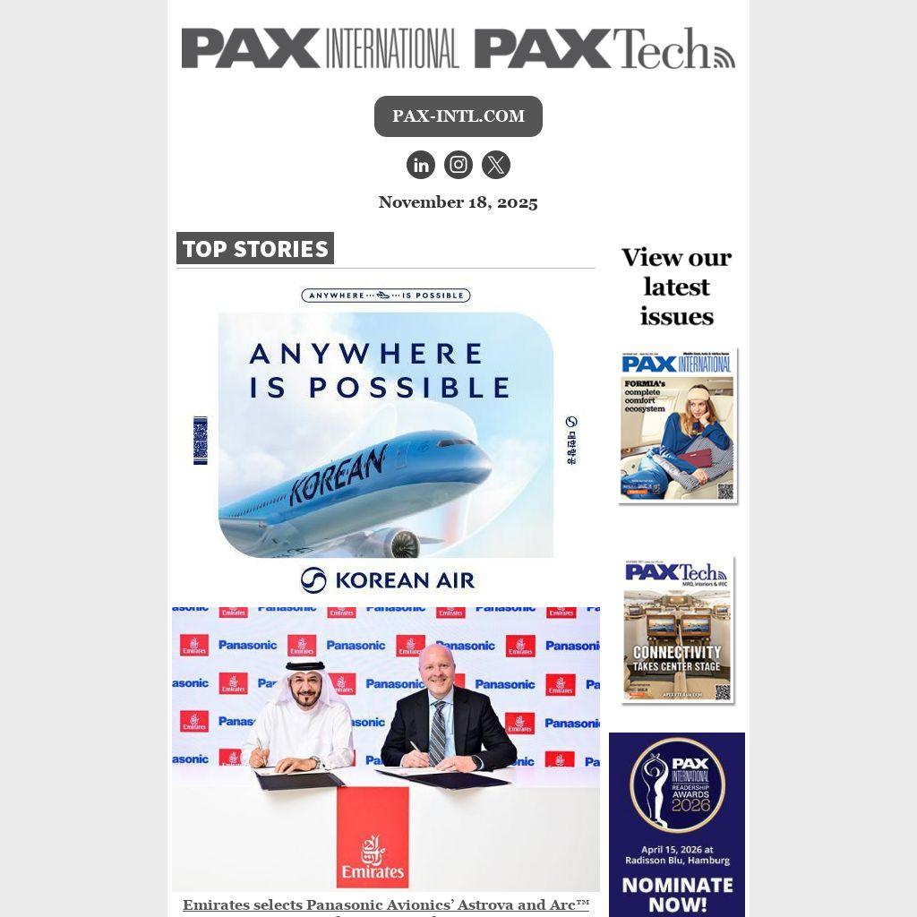 Emirates selects Panasonic Avionics’ Astrova and Arc™ for 111 aircraft