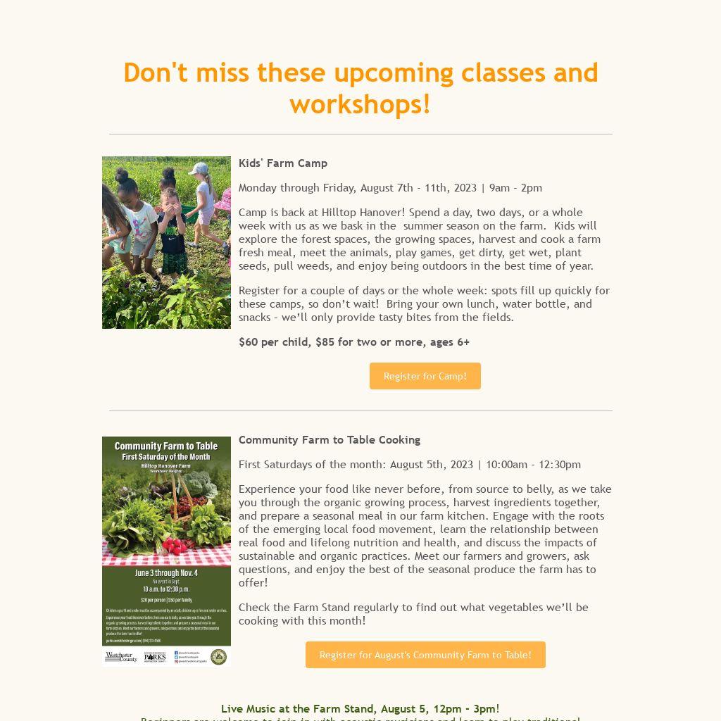 Register for a couple of days or the whole week: spots fill up quickly for these camps, so don’t wait! Bring your own lunch, water bottle, and snacks – we’ll only provide tasty bites from the fields.