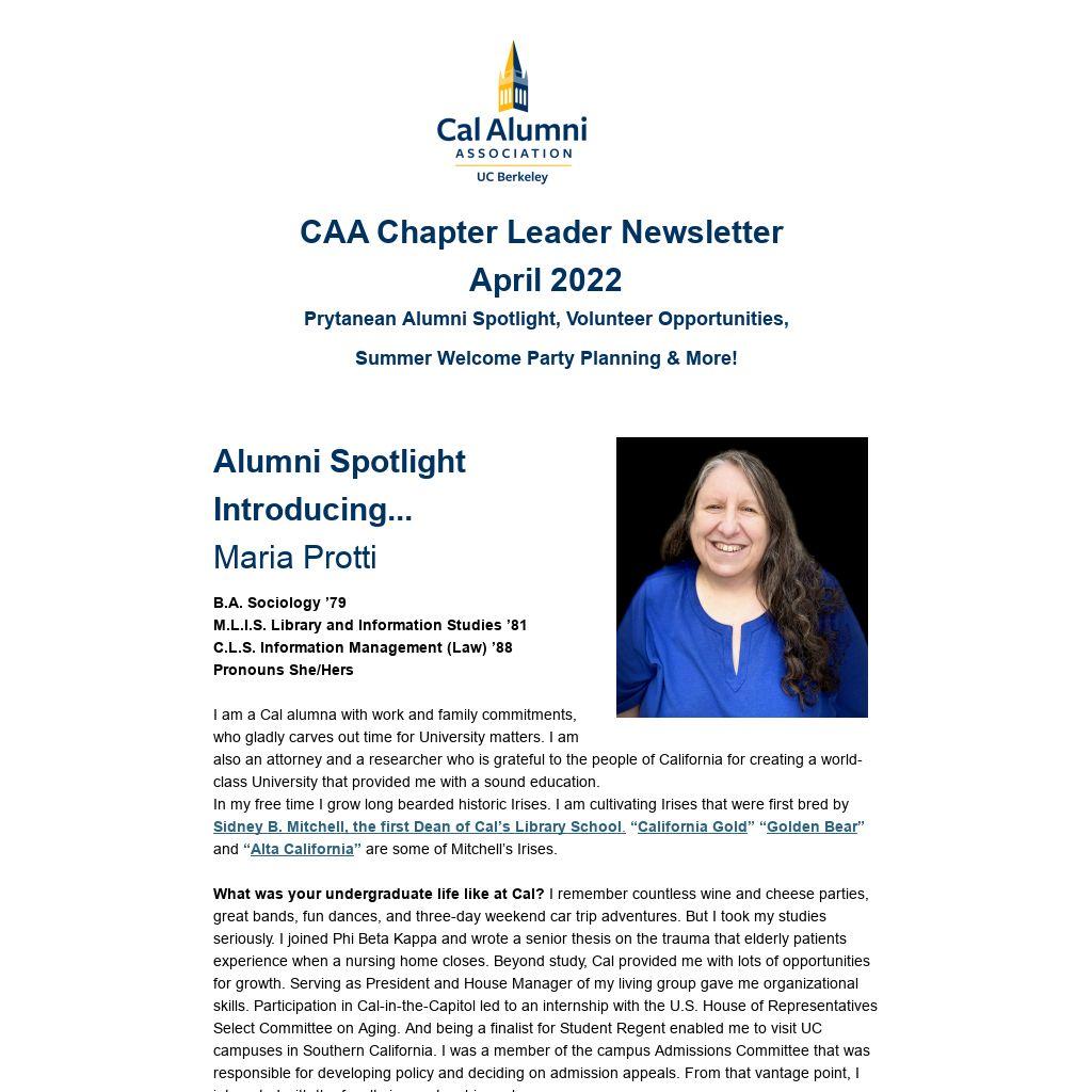How do you tap into your Cal Alumni network? I joined CAA a few weeks after I first graduated and I am so glad I did. Over the years, I’ve attended Homecoming Weekends and many CAA Leadership Conferences. And I’m a Co-class Secretary reporting to California Magazine. There are always continuous, enticing events on campus for alumni. Just today, I signed-up for a talk by one of my former professors, Harry Edwards, Sports Sociologist, to be held at Alumni House. Additionally, I am very involved in Prytanean Alumnae Inc. – a group of women who have pledged dedication and service to the University of California at Berkeley. I have made sincere friendships with Prytaneans who are strong, energetic, and sharp minded, salt-of-the-earth people. The Prytanean Society began in 1900 on the Cal campus and has been active ever since. We give grants for student events, scholarships, a faculty enrichment award, and sponsor a faculty lecture.