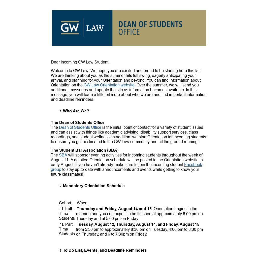 Welcome to GW Law! We hope you are excited and proud to be starting here this fall. We are thinking about you as the summer hits full swing, eagerly anticipating your arrival, and planning for your Orientation and beyond. You can find information about Orientation on the GW Law Orientation website. Over the summer, we will send you additional messages and update the site as information becomes available. In this message, you will learn a little bit more about who we are and find important information and deadline reminders.