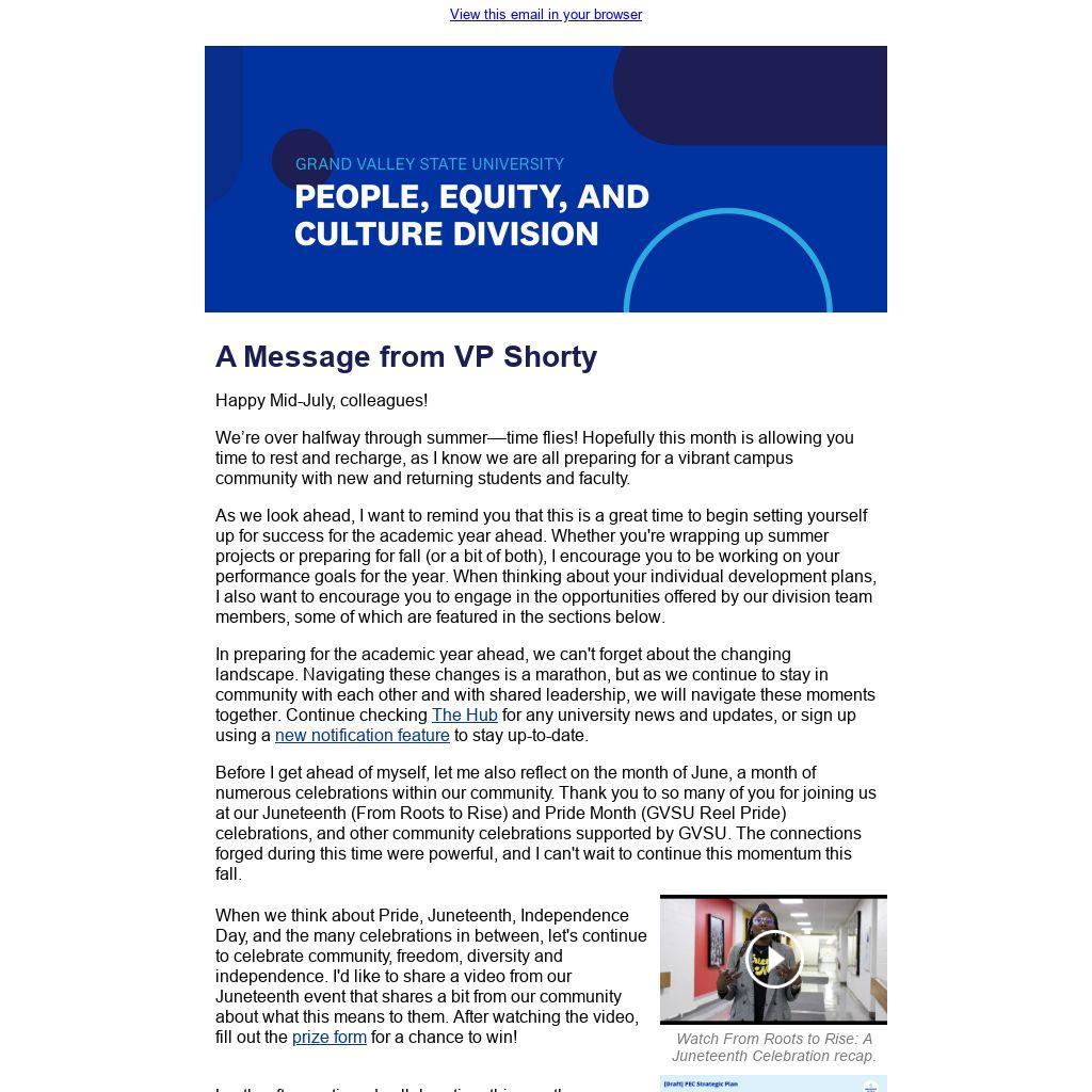 Before I get ahead of myself, let me also reflect on the month of June, a month of numerous celebrations within our community. Thank you to so many of you for joining us at our Juneteenth (From Roots to Rise) and Pride Month (GVSU Reel Pride) celebrations, and other community celebrations supported by GVSU. The connections forged during this time were powerful, and I can't wait to continue this momentum this fall.