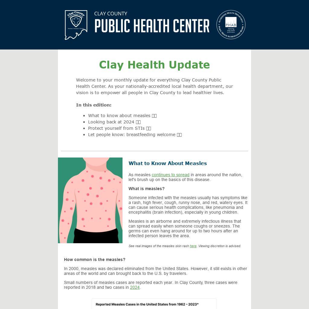 Welcome to your monthly update for everything Clay County Public Health Center. As your nationally-accredited local health department, our vision is to empower all people in Clay County to lead healthier lives.