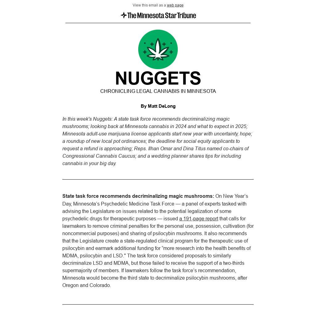 In this week's Nuggets: A state task force recommends decriminalizing magic mushrooms; looking back at Minnesota cannabis in 2024 and what to expect in 2025; Minnesota adult-use marijuana license applicants start new year with uncertainty, hope; a roundup of new local pot ordinances; the deadline for social equity applicants to request a refund is approaching; Reps. Ilhan Omar and Dina Titus named co-chairs of Congressional Cannabis Caucus; and a wedding planner shares tips for including cannabis in your big day.