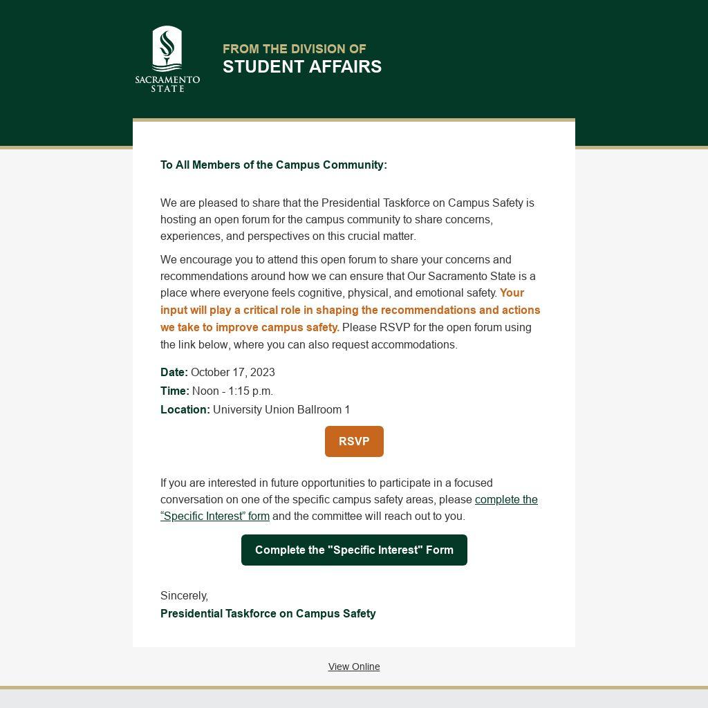 We encourage you to attend this open forum to share your concerns and recommendations around how we can ensure that Our Sacramento State is a place where everyone feels cognitive, physical, and emotional safety. Your input will play a critical role in shaping the recommendations and actions we take to improve campus safety. Please RSVP for the open forum using the link below, where you can also request accommodations.
