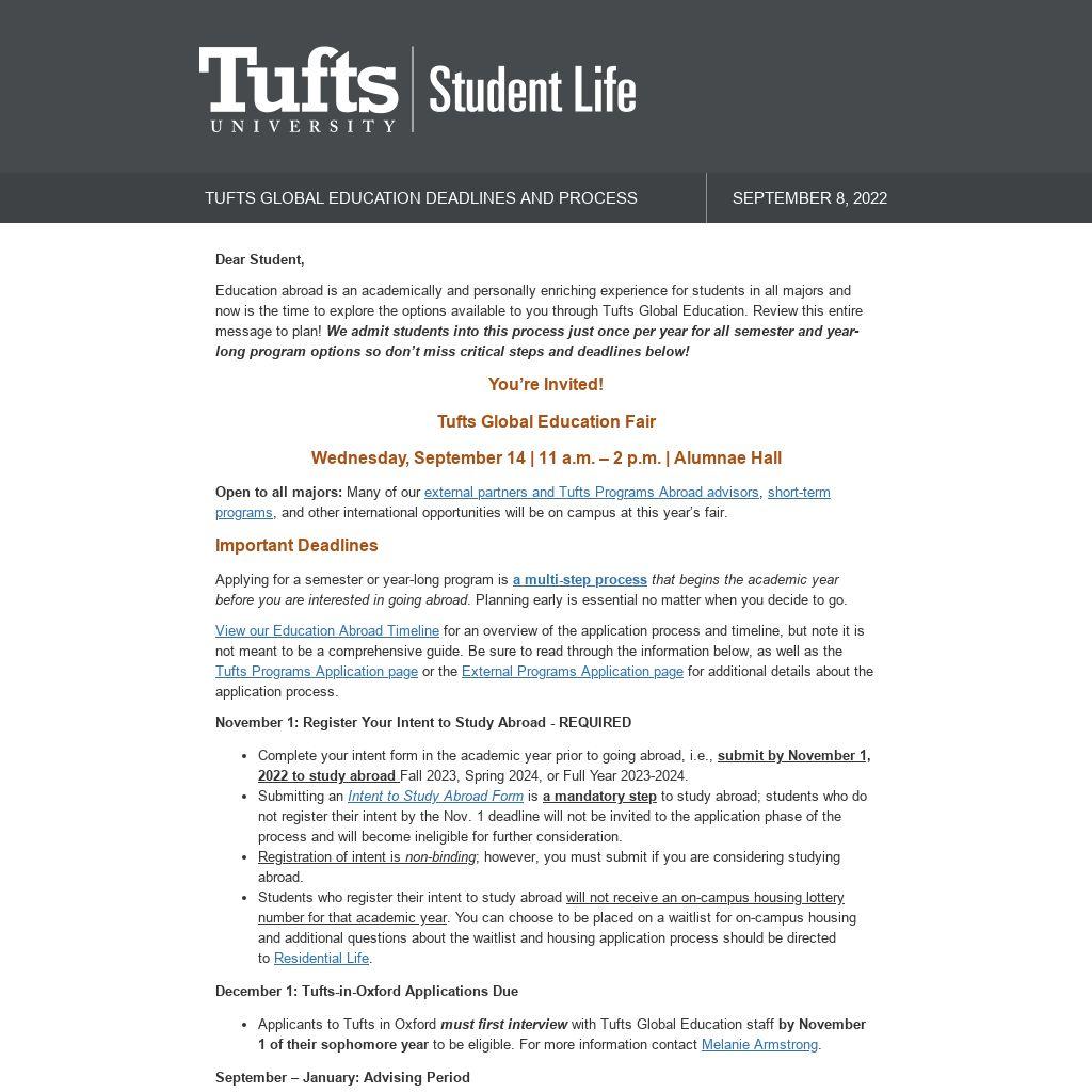 Education abroad is an academically and personally enriching experience for students in all majors and now is the time to explore the options available to you through Tufts Global Education. Review this entire message to plan! We admit students into this process just once per year for all semester and year-long program options so don’t miss critical steps and deadlines below!