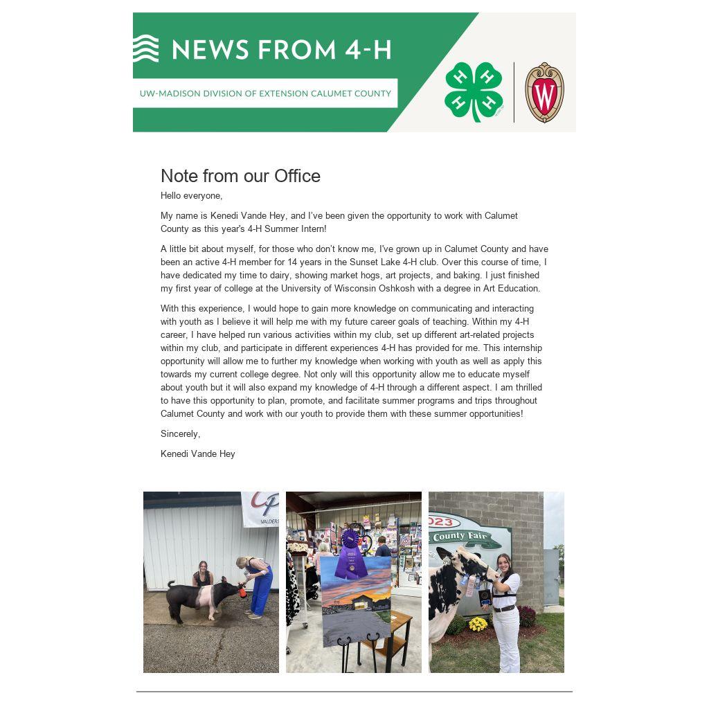 My name is Kenedi Vande Hey, and I’ve been given the opportunity to work with Calumet County as this year's 4-H Summer Intern!
