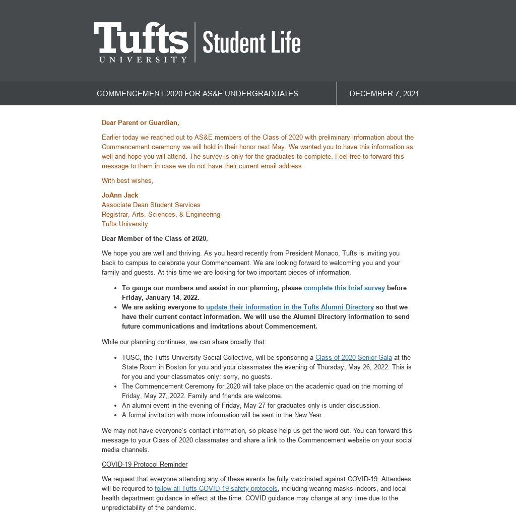 We hope you are well and thriving. As you heard recently from President Monaco, Tufts is inviting you back to campus to celebrate your Commencement. We are looking forward to welcoming you and your family and guests. At this time we are looking for two important pieces of information.