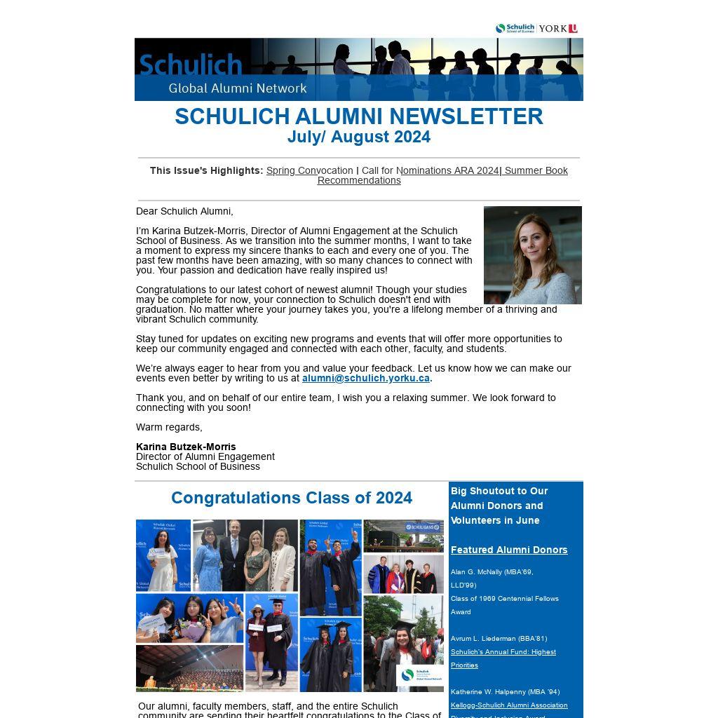 I’m Karina Butzek-Morris, Director of Alumni Engagement at the Schulich School of Business. As we transition into the summer months, I want to take a moment to express my sincere thanks to each and every one of you. The past few months have been amazing, with so many chances to connect with you. Your passion and dedication have really inspired us!