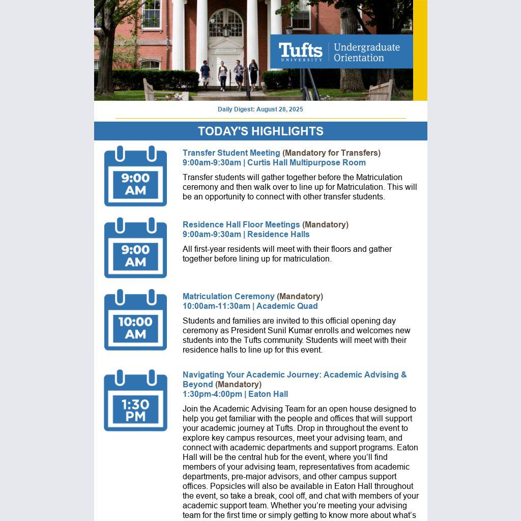 Tufts University Undergraduate Orientation is committed to providing equal access to our services, events and programs. If you require accommodations for any part of Undergraduate Orientation, please contact orientation@tufts.edu or 617-627-4678.