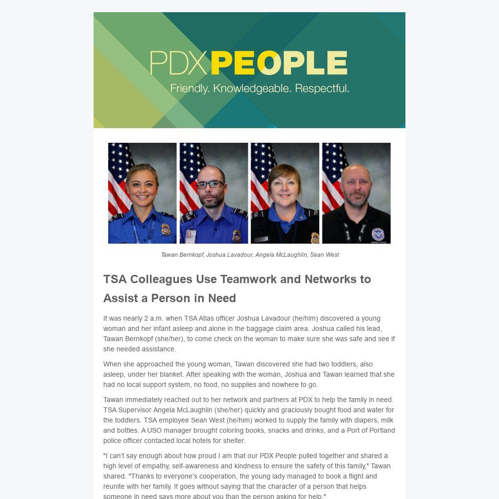 Tawan immediately reached out to her network and partners at PDX to help the family in need. TSA Supervisor Angela McLaughlin (she/her) quickly and graciously bought food and water for the toddlers. TSA employee Sean West (he/him) worked to supply the family with diapers, milk and bottles. A USO manager brought coloring books, snacks and drinks, and a Port of Portland police officer contacted local hotels for shelter.