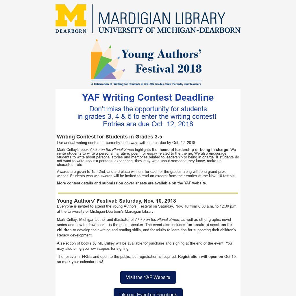 Everyone is invited to attend the Young Authors' Festival on Saturday, Nov. 10 from 8:30 a.m. to 12:30 p.m. at the University of Michigan-Dearborn's Mardigian Library.
