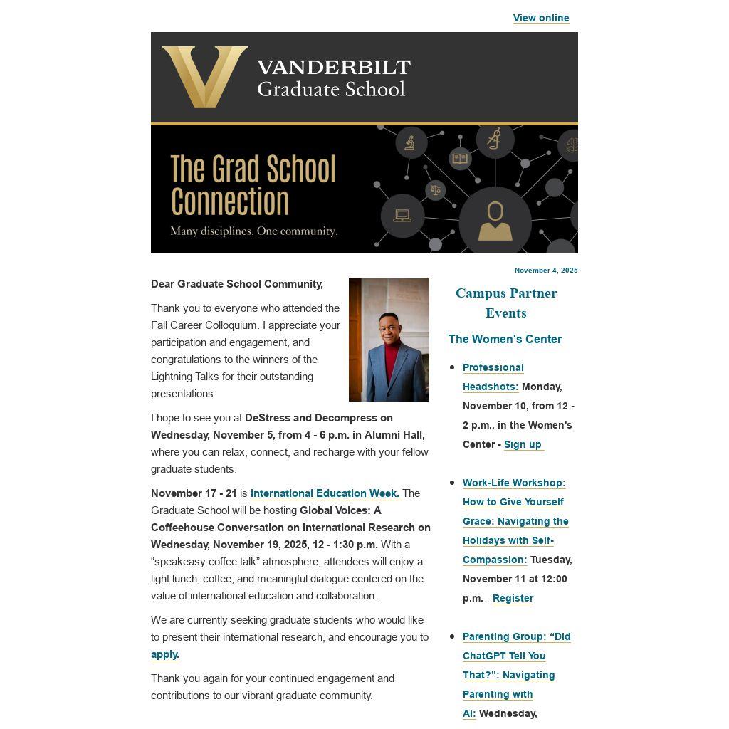 I hope to see you at DeStress and Decompress on Wednesday, November 5, from 4 - 6 p.m. in Alumni Hall, where you can relax, connect, and recharge with your fellow graduate students.