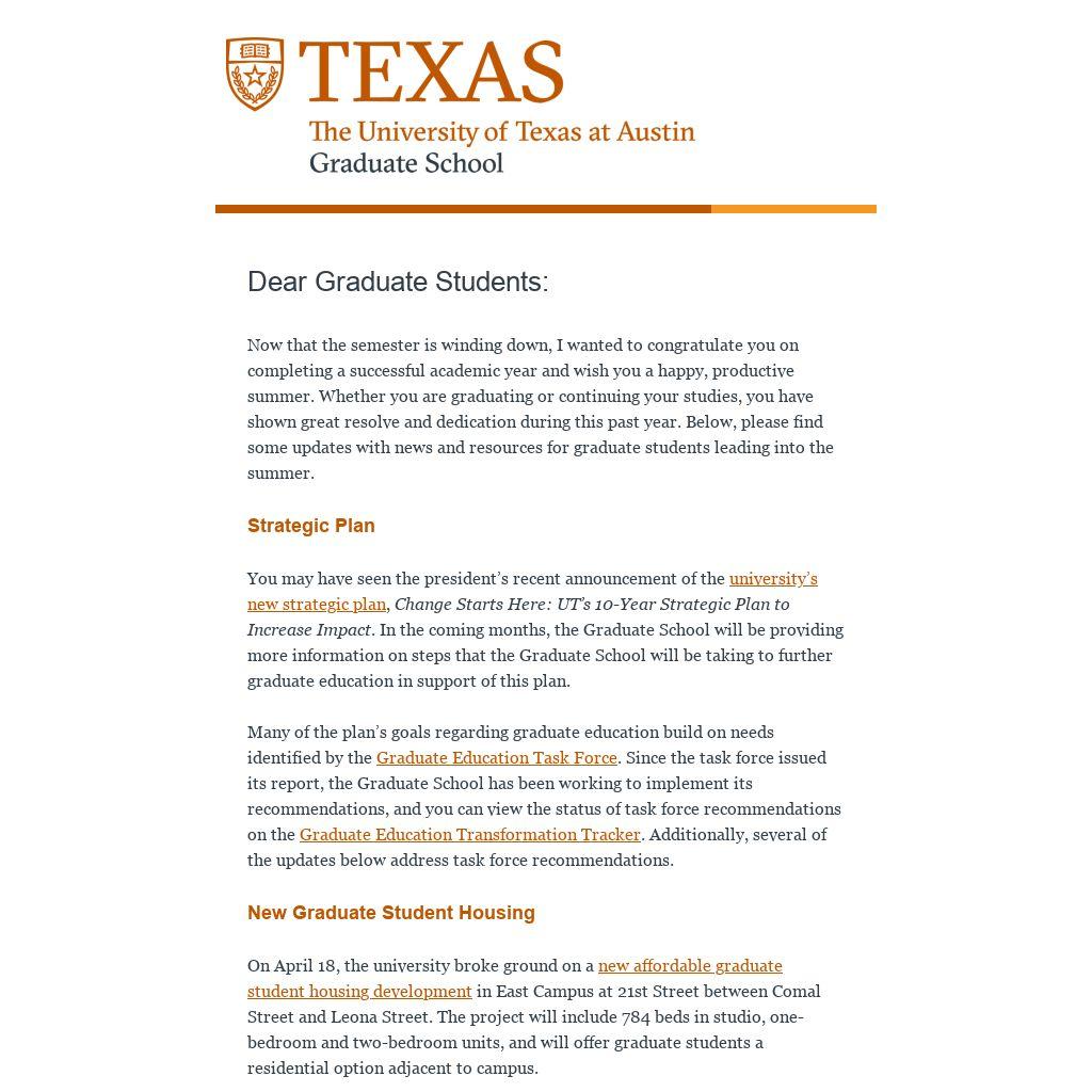 You may have seen the president’s recent announcement of the university’s new strategic plan, Change Starts Here: UT’s 10-Year Strategic Plan to Increase Impact. In the coming months, the Graduate School will be providing more information on steps that the Graduate School will be taking to further graduate education in support of this plan.