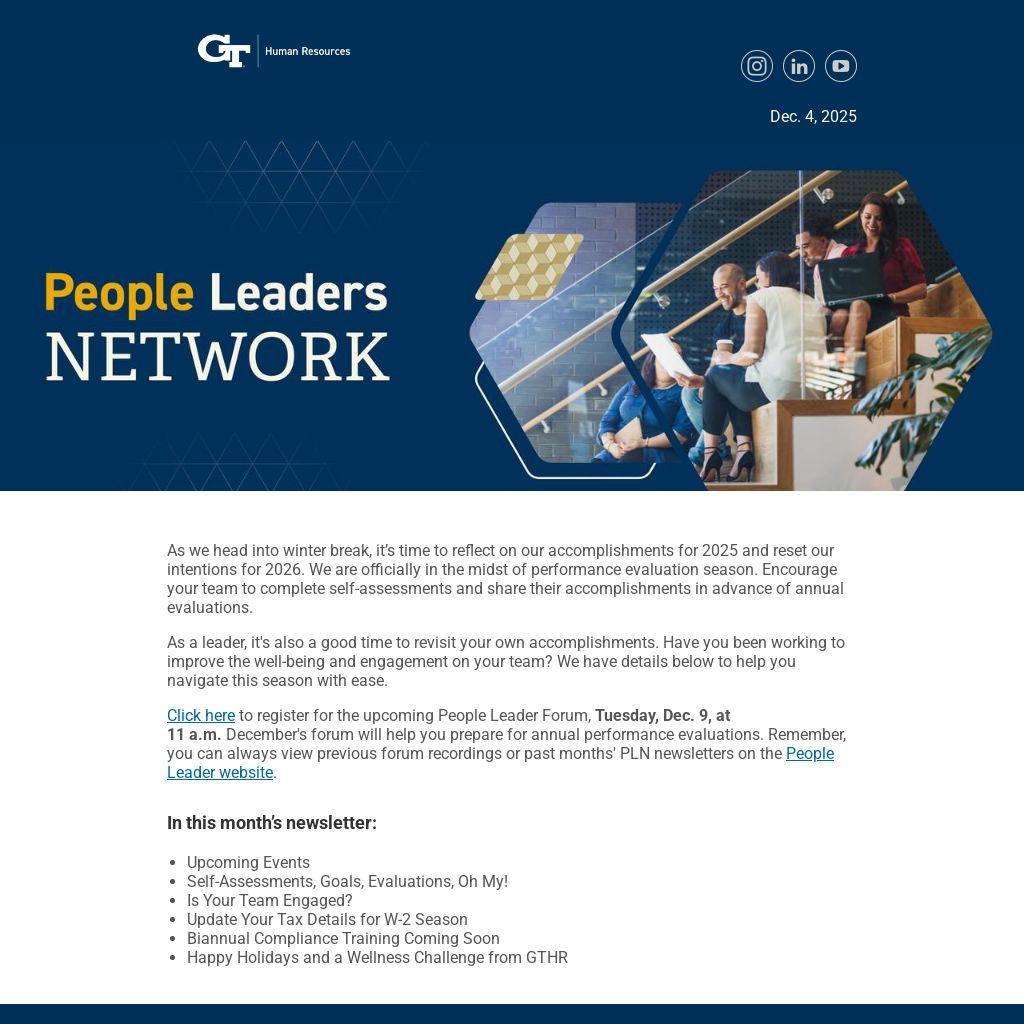 Click here to register for the upcoming People Leader Forum, Tuesday, Dec. 9, at 11 a.m. December's forum will help you prepare for annual performance evaluations. Remember, you can always view previous forum recordings or past months' PLN newsletters on the People Leader website.