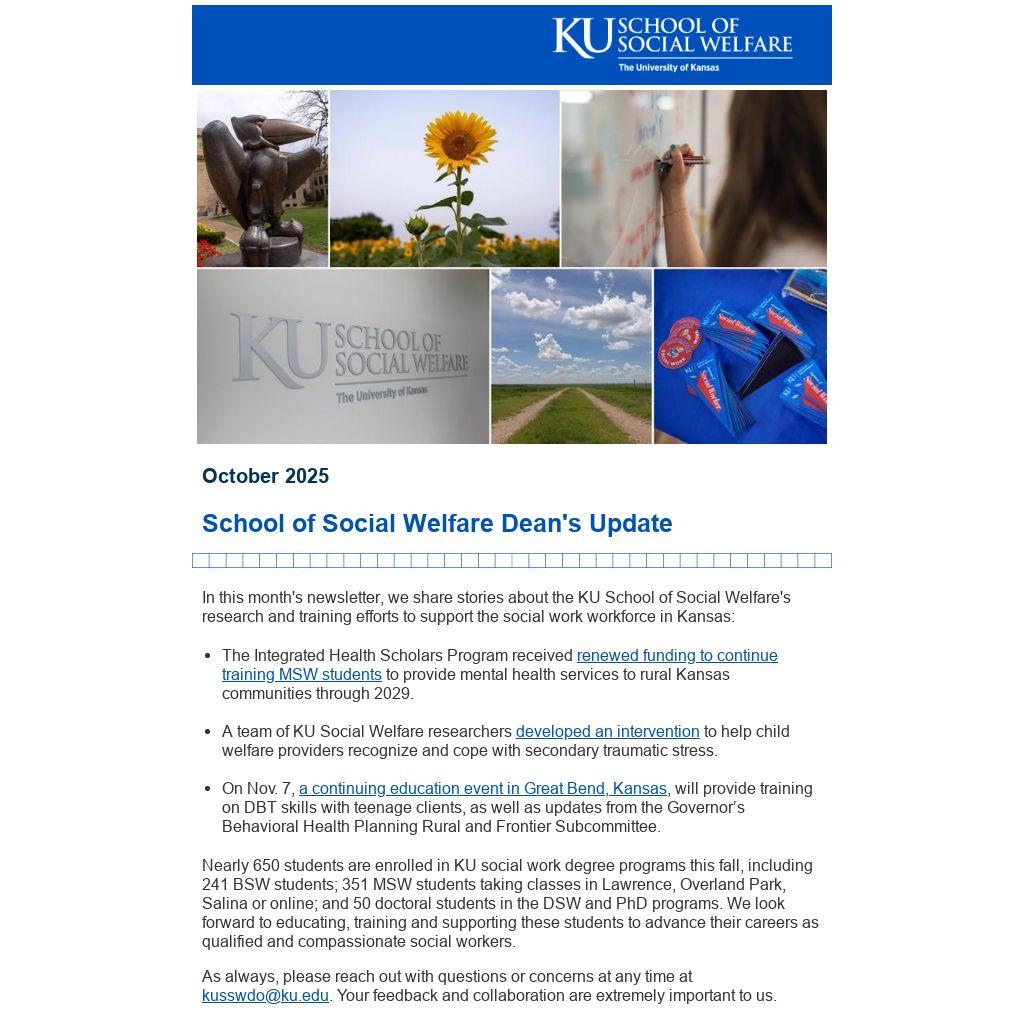 In this month's newsletter, we share stories about the KU School of Social Welfare's research and training efforts to support the social work workforce in Kansas: