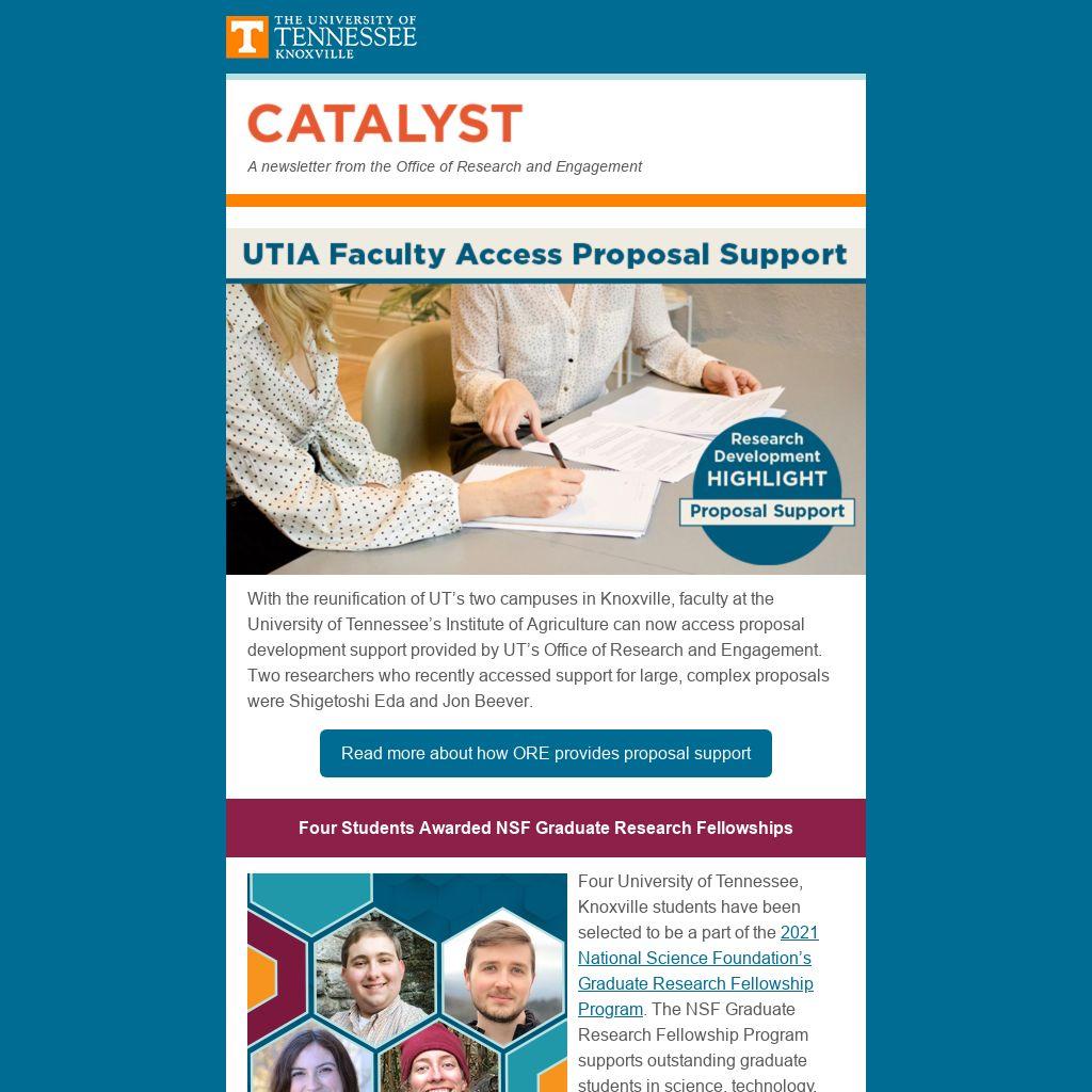 Faculty, staff, and students celebrated at Chancellor's Honors Banquet, Engineering students earn honors at the 18th annual TLSAMP Awards—Plant sciences faculty receive award for COVID-19 communication—CGE announces 2021 McClure and Mae Scheib Scholars—JEM students earn accolades from 2021 South East Journalism Conference—Michael O. Wirth named 2021 Broadcast Education Association’s DESA winner—Carol Harden receives AAG Lifetime Achievement Award—Liem Tran and Hyun Kim honored with Sustainability Science Award—Bhavya Sharma wins 2021 Emerging Leader in Molecular Spectroscopy award.