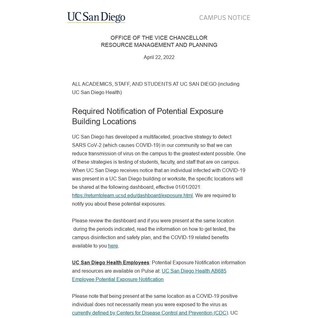 UC San Diego has developed a multifaceted, proactive strategy to detect SARS CoV-2 (which causes COVID-19) in our community so that we can reduce transmission of virus on the campus to the greatest extent possible. One of these strategies is testing of students, faculty, and staff that are on campus. When UC San Diego receives notice that an individual infected with COVID‐19 was present in a UC San Diego building or worksite, the specific locations will be shared at the following dashboard, effective 01/01/2021: https://returntolearn.ucsd.edu/dashboard/exposure.html. We are required to notify you about these potential exposures.