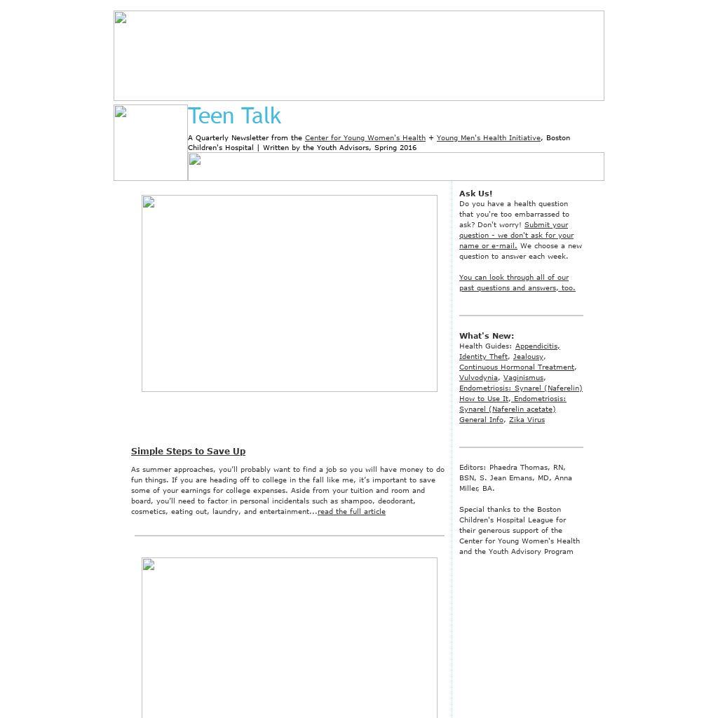 Special thanks to the Boston Children's Hospital League for their generous support of the Center for Young Women's Health and the Youth Advisory Program