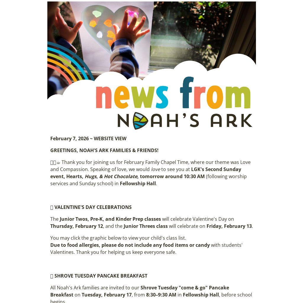 All Noah's Ark families are invited to our Shrove Tuesday "come & go" Pancake Breakfast on Tuesday, February 17, from 8:30–9:30 AM in Fellowship Hall, before school begins.