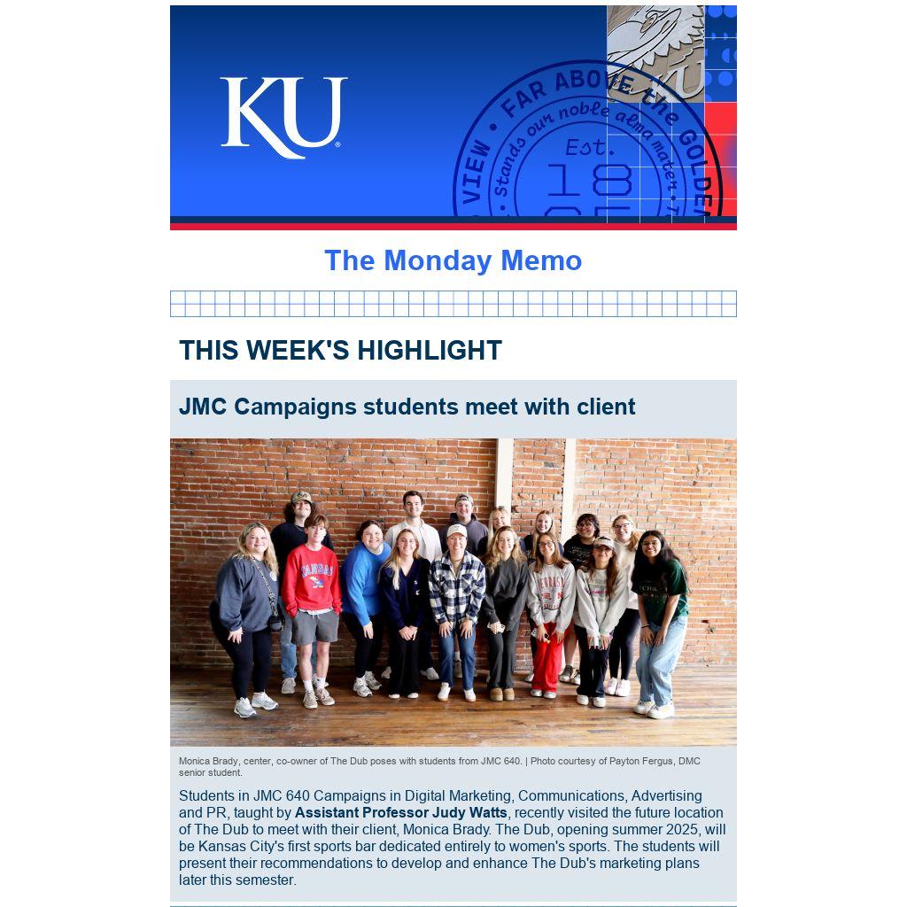 Students in JMC 640 Campaigns in Digital Marketing, Communications, Advertising and PR, taught by Assistant Professor Judy Watts, recently visited the future location of The Dub to meet with their client, Monica Brady. The Dub, opening summer 2025, will be Kansas City's first sports bar dedicated entirely to women's sports. The students will present their recommendations to develop and enhance The Dub's marketing plans later this semester.