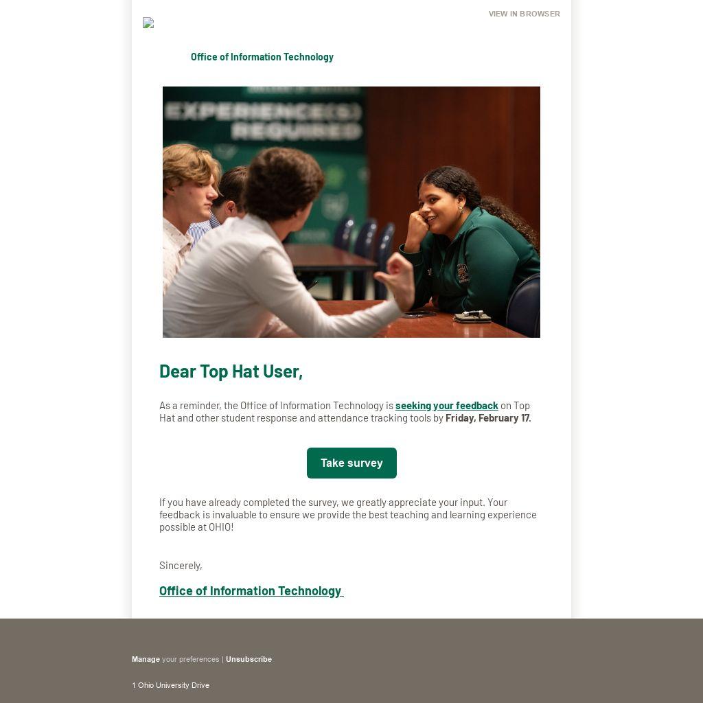 If you have already completed the survey, we greatly appreciate your input. Your feedback is invaluable to ensure we provide the best teaching and learning experience possible at OHIO!