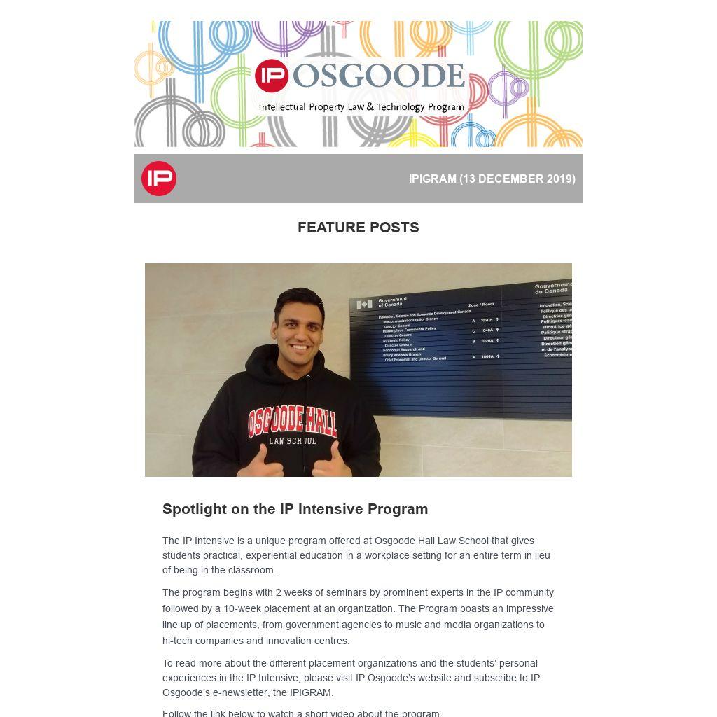 I am incredibly grateful to my supervisors at Teva, Ben Gray (General Counsel) and David Solomon (Senior Legal Counsel), for their mentorship and for creating such a supportive and varied educational experience – I feel lucky to have learned from them both! Thank you to Professor D’Agostino, Professor Vaver, and the entire IP Osgoode team for making this program possible.