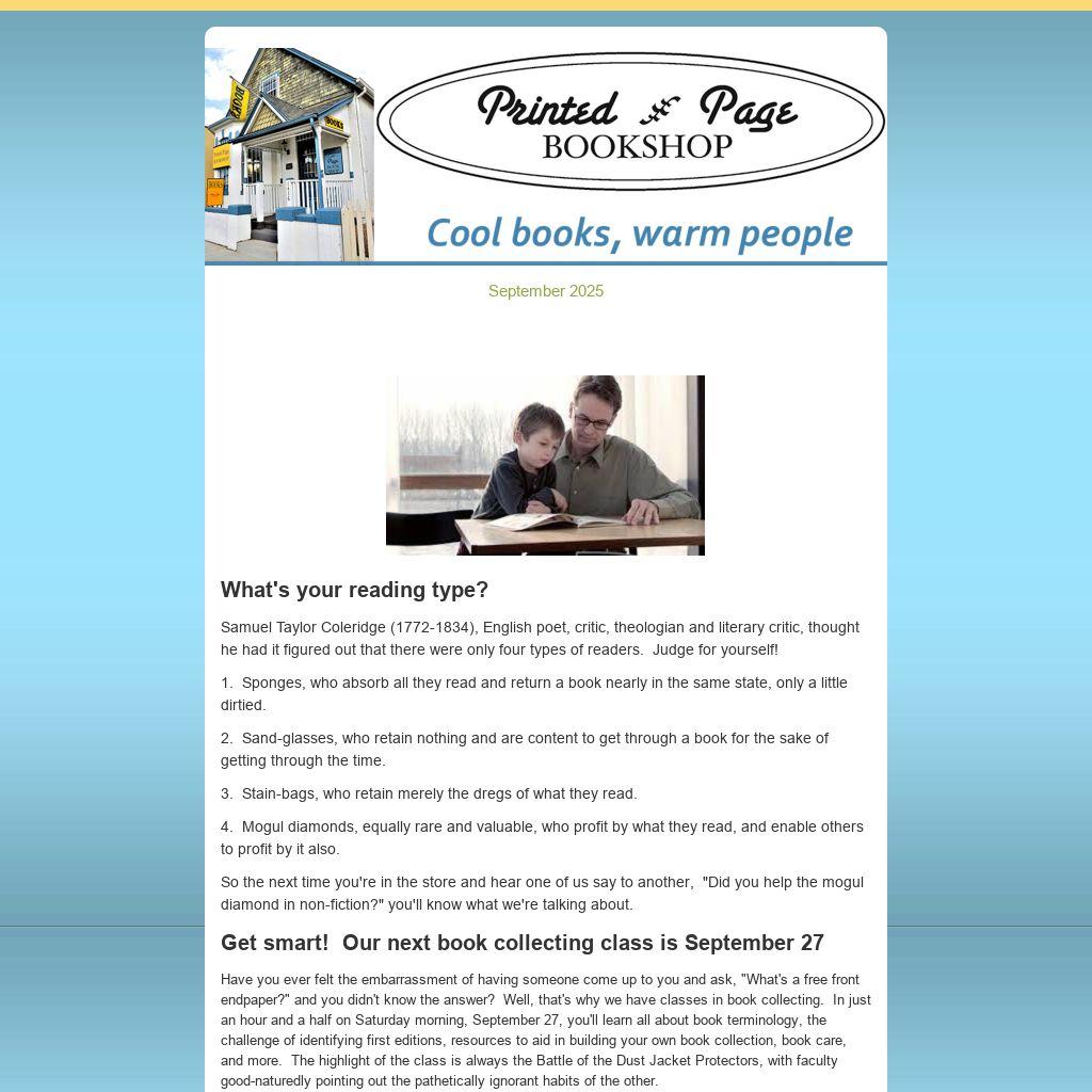 The class runs from 9 to 10:30 and is free -- but seating is limited, so reserve your spot now by letting us know by dropping a note to theshop@printedpagebookshop.com.