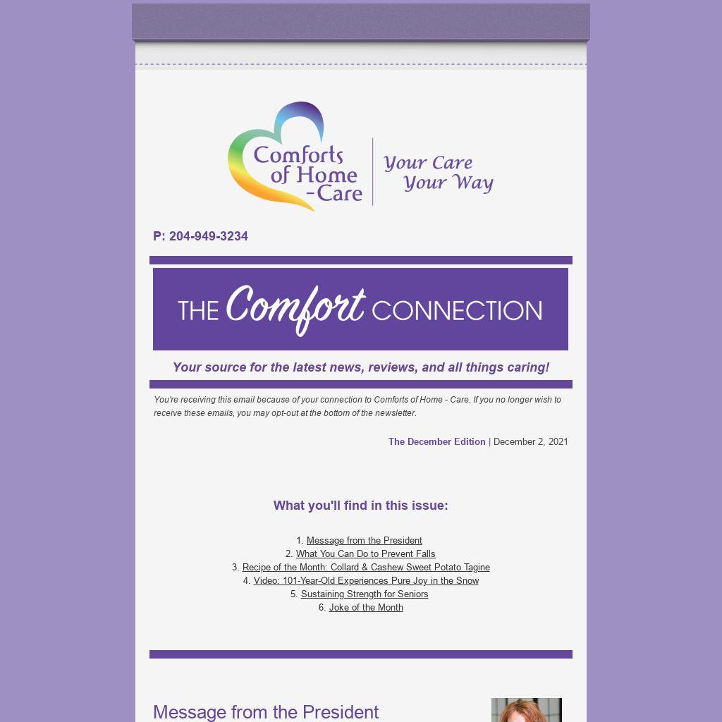 Greetings friend, and welcome to the December Comfort Connection!