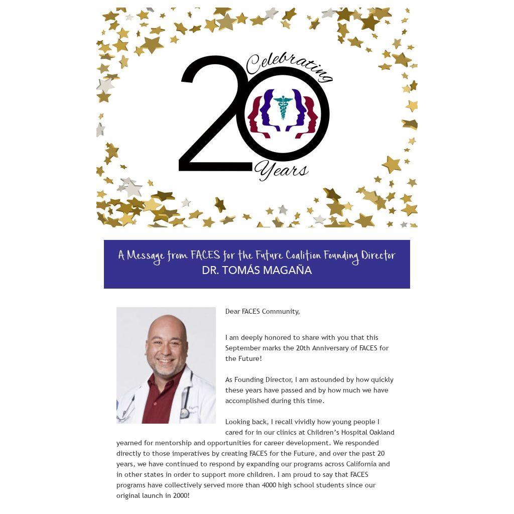 I am deeply honored to share with you that this September marks the 20th Anniversary of FACES for the Future!