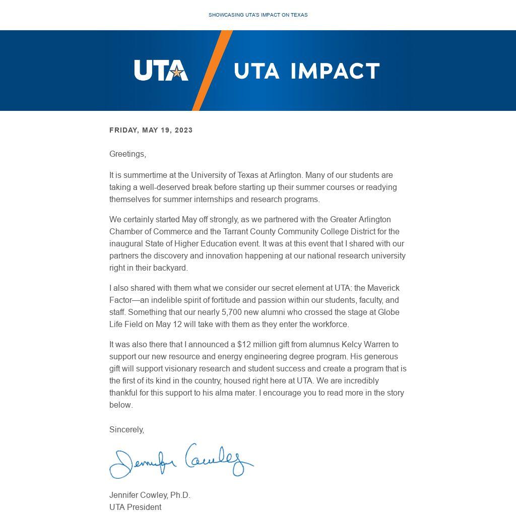 It was also there that I announced a $12 million gift from alumnus Kelcy Warren to support our new resource and energy engineering degree program. His generous gift will support visionary research and student success and create a program that is the first of its kind in the country, housed right here at UTA. We are incredibly thankful for this support to his alma mater. I encourage you to read more in the story below.