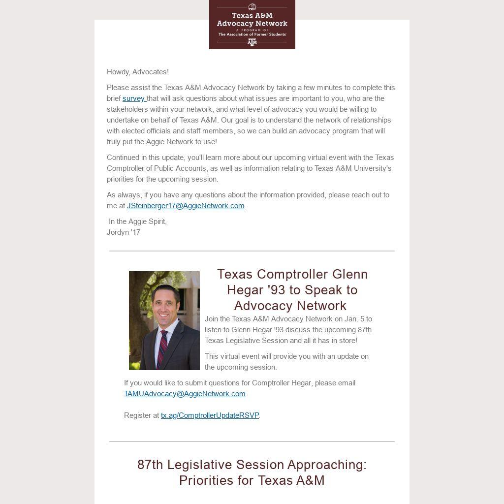 Join the Texas A&M Advocacy Network on Jan. 5 to listen to Glenn Hegar '93 discuss the upcoming 87th Texas Legislative Session and all it has in store!