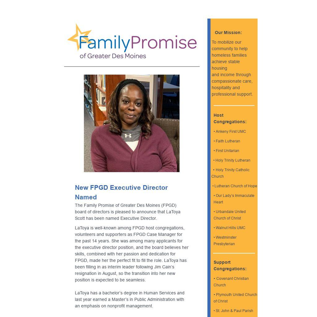 The Family Promise of Greater Des Moines (FPGD) board of directors is pleased to announce that LaToya Scott has been named Executive Director.