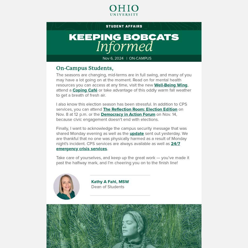 Visit www.ohio.edu/equity-civil-rights for Ohio University's Title IX Coordinator contact information and Notice of Non-Discrimination. ©2024 Ohio University. All rights reserved.