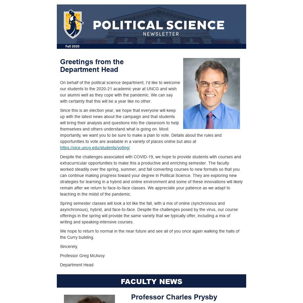 On behalf of the political science department, I’d like to welcome our students to the 2020-21 academic year at UNCG and wish our alumni well as they cope with the pandemic. We can say with certainty that this will be a year like no other.