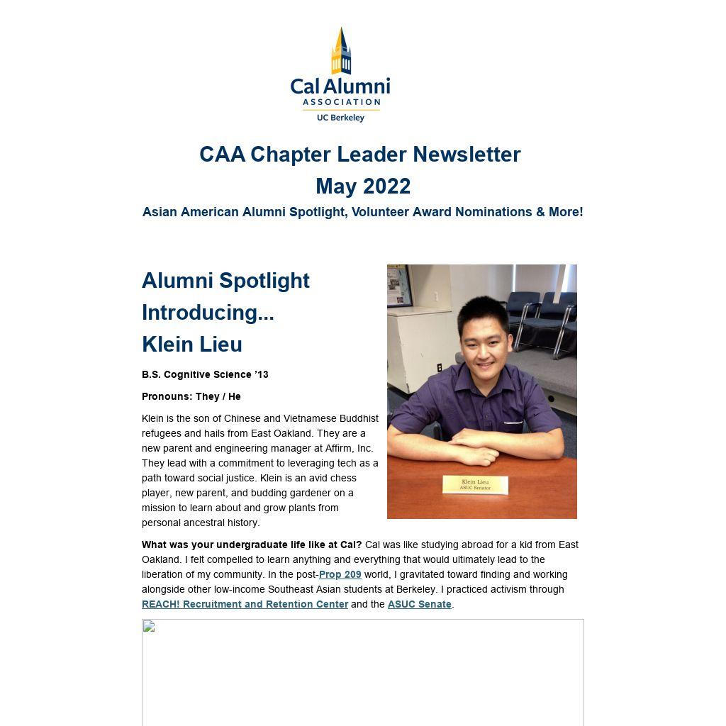 Talk about your involvement in your Cal Alumni Chapter, why you joined and why you continue to contribute. I joined and continue to be involved because Cal is a springboard for the Asian American experience. Look around Cal's history and you see that it has been a foundational epicenter for writers, community builders, scientists, and engineers who have a deep understanding of what it takes to craft a cultural identity for diasporic Asian communities in America. Being involved with the Berkeley Asian American Alumni Group, I’ve learned that both students and the campus could use a lot of support. COVID-19 derailed the momentum of campus life and student activism, and saw a spike in anti-Asian hate. There’s a need and opportunity for Asian American alumni in industry to bridge gaps and demonstrate to students that they are not alone in figuring out how to navigate their futures.