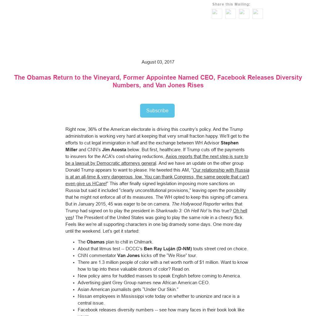| FOMOFriday, August 4th, 5:30P: Black 44 sponsors a happy hour to celebrate former President Barack Obama's birthday. Invite only. Saturday, August 5th, 3P: The Congressional Hispanic Staff Association hosts a tailgate before the DC United v. Toronto FC game. For more info, email James Hauser at: jph86@georgetown.edu Wednesday, August 9th - 13th: The National Association of Black Journalists (NABJ) holds its annual convention and career fair in New Orleans. Click here for more information and to register. Thursday, August 10th - 13th: The Congressional Black Caucus Political Education & Leadership Institute sponsors the 2017 Mississippi Policy Conference in Tunica, MS. Click here for more information and to register. Monday, August 14th, 4P: The Center for American Progress sponsors a panel discussion, "The Power of Black Media and Journalists During the Trump Administration." Click here to RSVP. Wednesday, August 16th - 17th: The annual U.S.-Mexico Border Summit. El Paso, TX & Cuidad Juárez, Chihuahua. Featured guests include keynote speaker Ana Navarro, Republican strategist and CNN analyst. Click here for more information and to register. Wednesday, August 16th - 20th: The Asian Pacific American Labor Alliance holds its 14th biennial convention in Anaheim, CA. Click here for more information. Friday, August 18th: The deadline to apply for the Poynter Institute and the National Association of Black Journalists (NABJ) 2017 Leadership Academy for Diversity in Digital Media, to be held Dec. 3rd - 8th in St. Petersburg, FL. The tuition-free program trains journalists of color to work in digital media. Click here for more information and to apply. Friday, August 18th - 20th: A weekend on Martha's Vineyard with Congresswoman Barbara Lee (D-CA) and special guests Congressmen James Clyburn (D-SC), Cedric Richmond (D-LA), and Richard Neal (D-MA), and Congresswomen Sheila Jackson Lee (D-TX) and Lisa Blunt Rochester (D-DE). For more information and to RSVP, contact Mariko Bennett: mariko@cocobproductions.com or call 301.741.3443. Thursday, August 25th, 8P: The film Hidden Figures will be shown as the final movie of the season at the MLK Memorial. Free. Sponsored by The Memorial Foundation and MPAA. 1964 Independence Avenue, S.W. For more information, click here. Monday, August 28th, 9A: The Collective hosts the 2017 Black Power Summit to discuss possibilities, challenges, and plans to capitalize on historic political opportunities and also economic and civil rights challenges the Black community will likely face in the 2018 and 2020 political cycles. For more information, contact Quentin James at: quentin@collectivepac.org