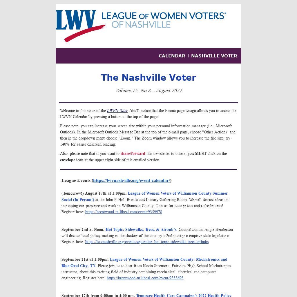 ATTENTION: The Nashville Voter is a digital publication. If you have received this copy of the Voter in the mail, it means the League of Women Voters of Nashville does not have an e-mail address for you. Please help us by sending your e-mail address to LWVNash@gmail.com. Being on the LWVN e-mail database ensures your receipt of all LWVN newsletters, event invitations, meeting announcements, and Call to Action alerts.