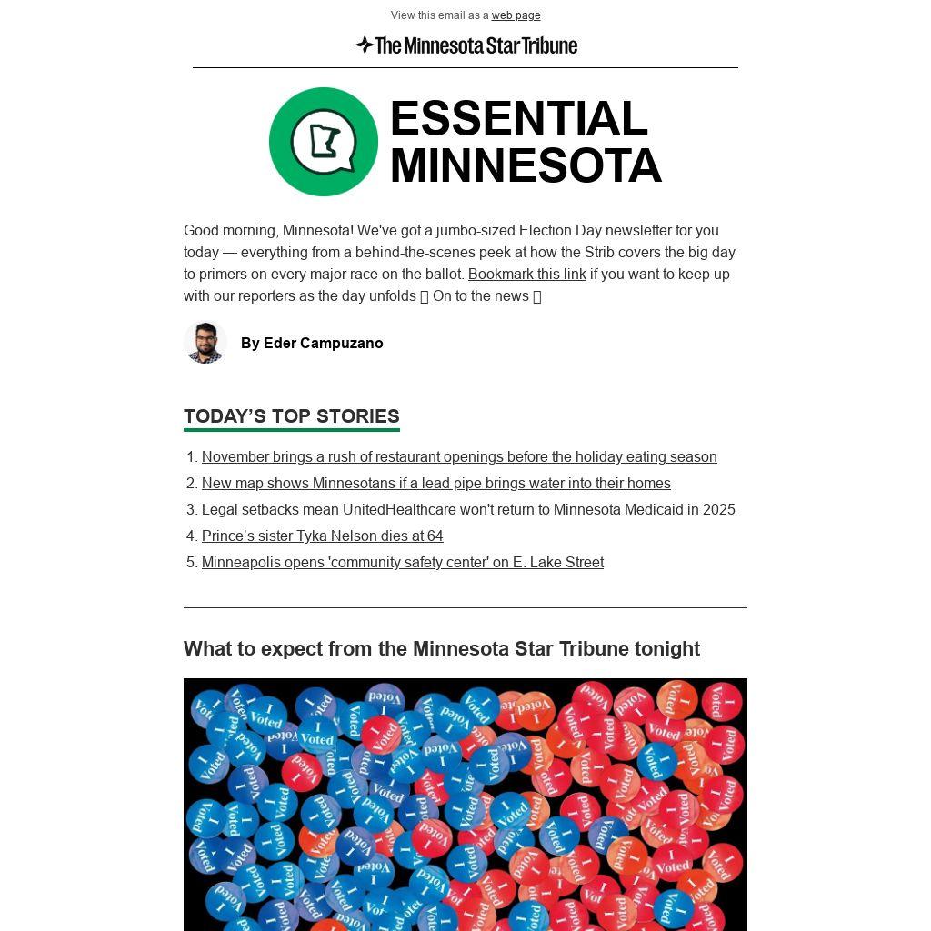 Greg Mees, the news organization's senior assistant managing editor, estimates we'll have about 125 Strib staffers working tonight. Several of them — including your friendly neighborhood newsletter writer — will be in the newsroom watching results roll in and planning coverage based on how those tallies work out.