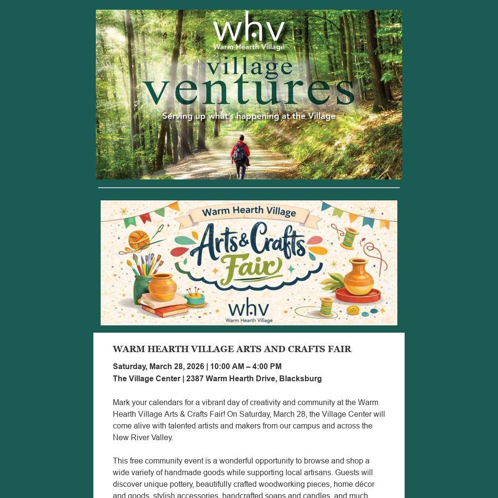 Mark your calendars for a vibrant day of creativity and community at the Warm Hearth Village Arts & Crafts Fair! On Saturday, March 28, the Village Center will come alive with talented artists and makers from our campus and across the New River Valley.