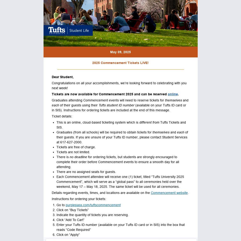 Graduates attending Commencement events will need to reserve tickets for themselves and each of their guests using their Tufts student ID number (available on your Tufts ID card or in SIS). Instructions for ordering tickets are included at the end of this message.