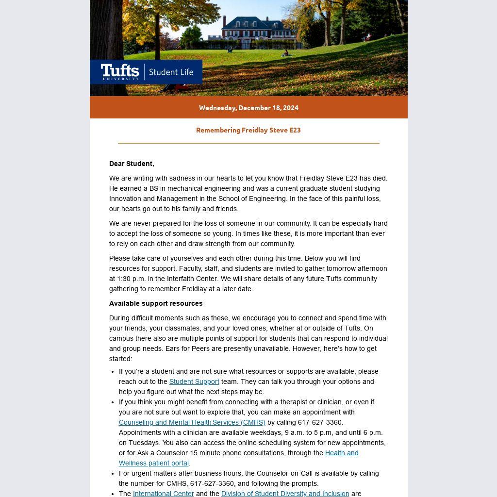Please take care of yourselves and each other during this time. Below you will find resources for support. Faculty, staff, and students are invited to gather tomorrow afternoon at 1:30 p.m. in the Interfaith Center. We will share details of any future Tufts community gathering to remember Freidlay at a later date.