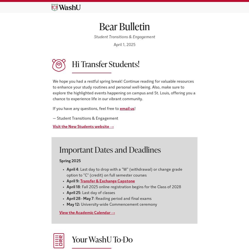 We hope you had a restful spring break! Continue reading for valuable resources to enhance your study routines and personal well-being. Also, make sure to explore the highlighted events happening on campus and St. Louis, offering you a chance to experience life in our vibrant community.