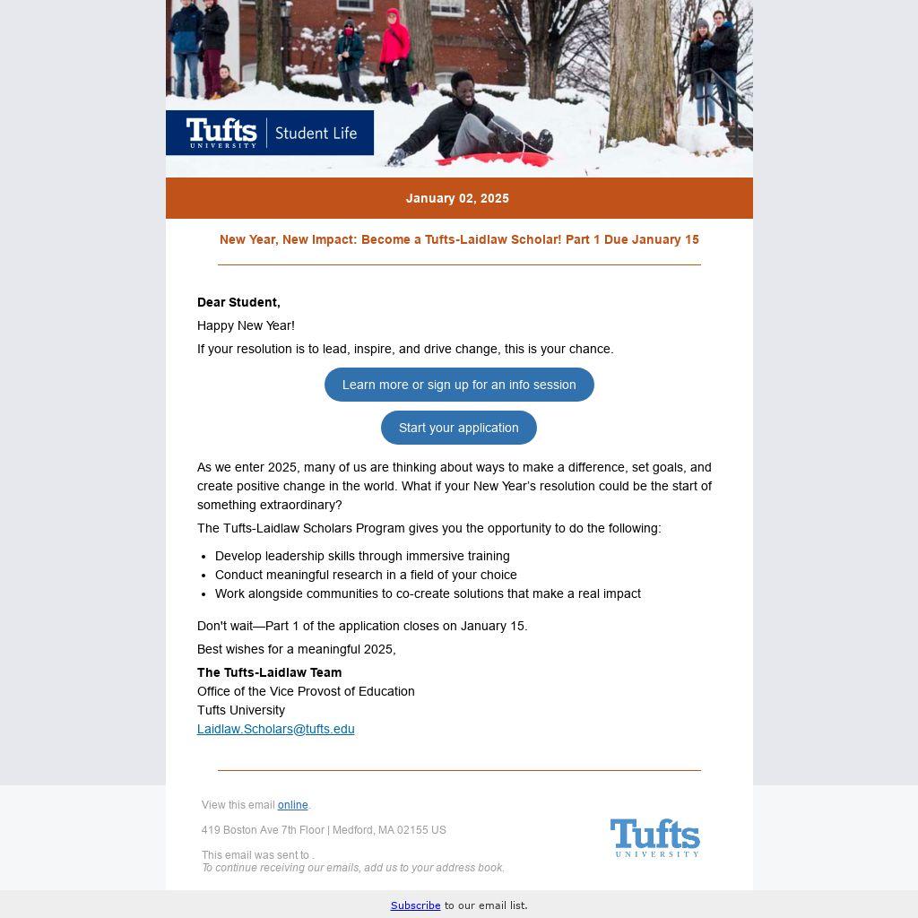 New Year, New Impact: Become a Tufts-Laidlaw Scholar! Part 1 Due January 15 |