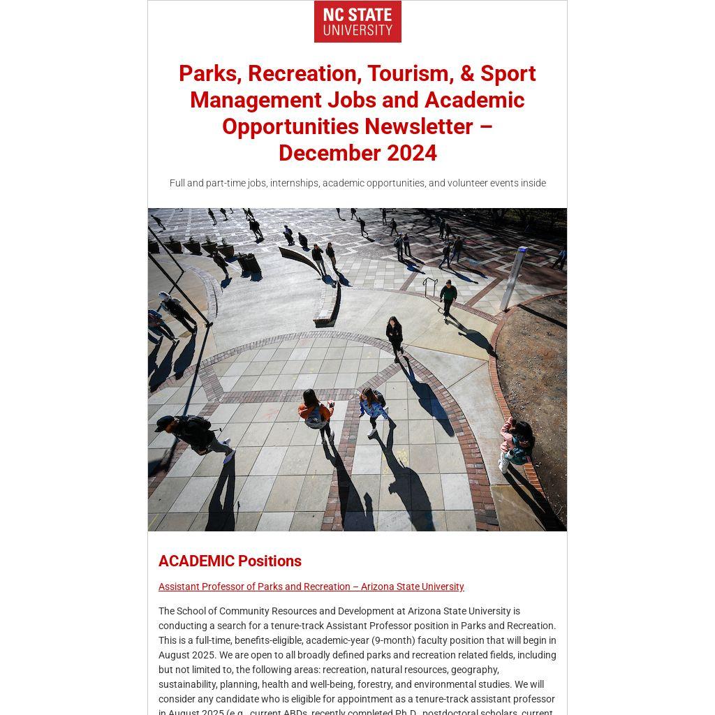 Parks, Recreation, Tourism, & Sport Management Jobs and Academic Opportunities Newsletter – December 2024