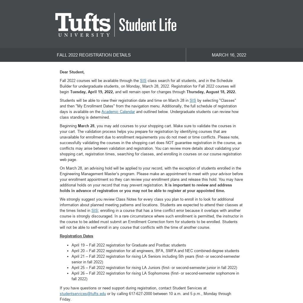 If you have questions or need support during registration, contact Student Services at studentservices@tufts.edu or by calling 617-627-2000 between 10 a.m. and 5 p.m., Monday through Friday.