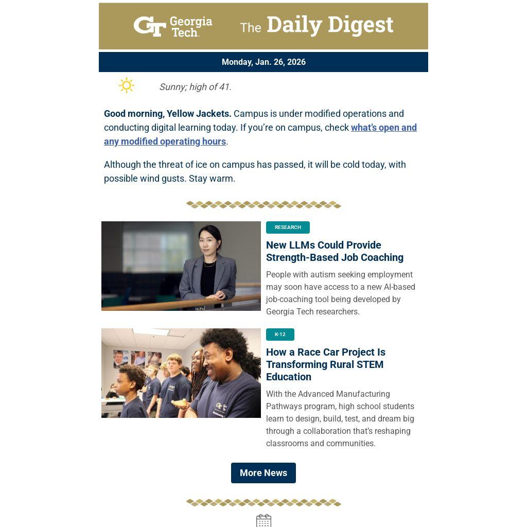Good morning, Yellow Jackets. Campus is under modified operations and conducting digital learning today. If you’re on campus, check what’s open and any modified operating hours.